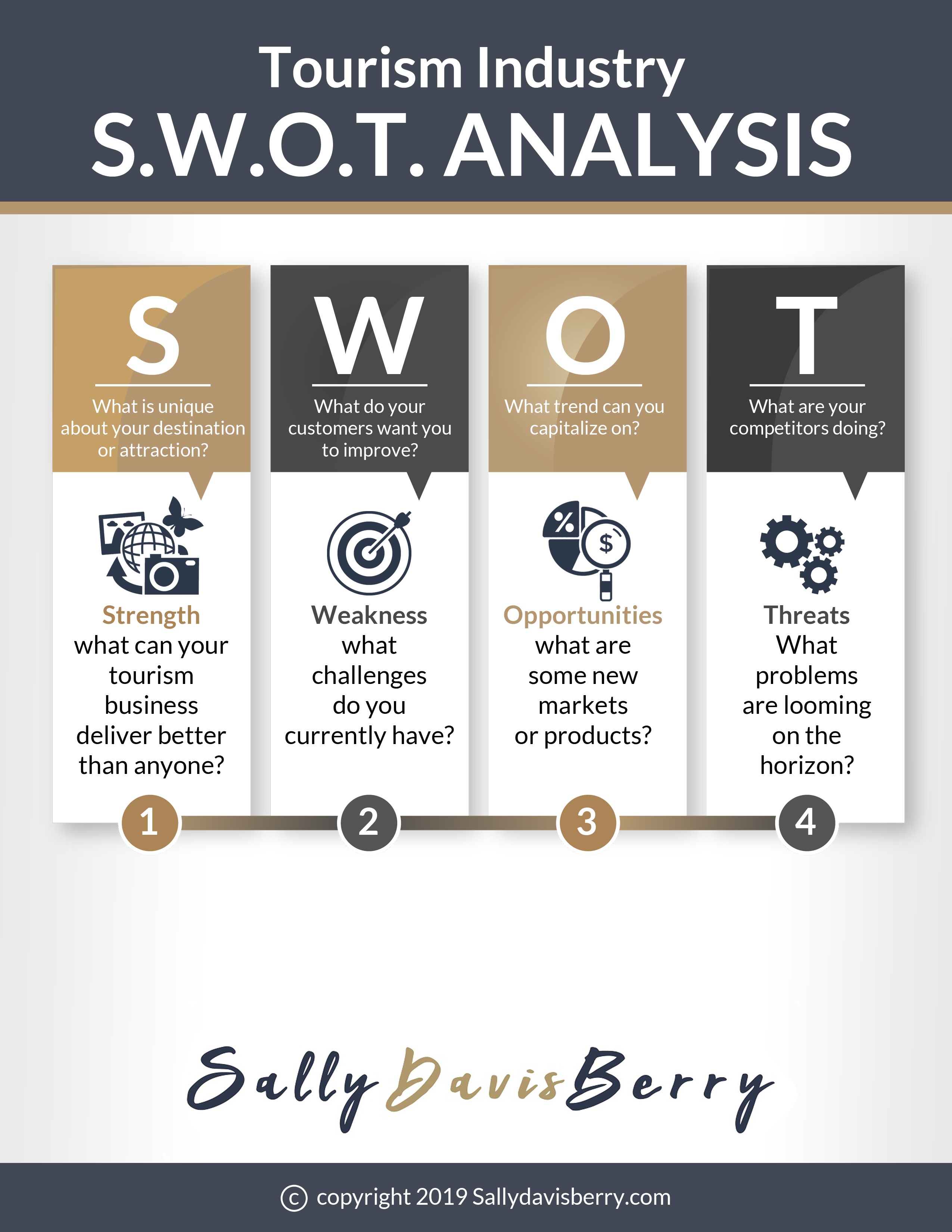 Have you started working on your S.W.O.T analysis yet? In a recent post, I shared some information and my free forms you can use to work on it. If you haven’t had a chance yet, print the S.W.O.T analysis for the Tourism Industry forms and let’s do some of the work together!